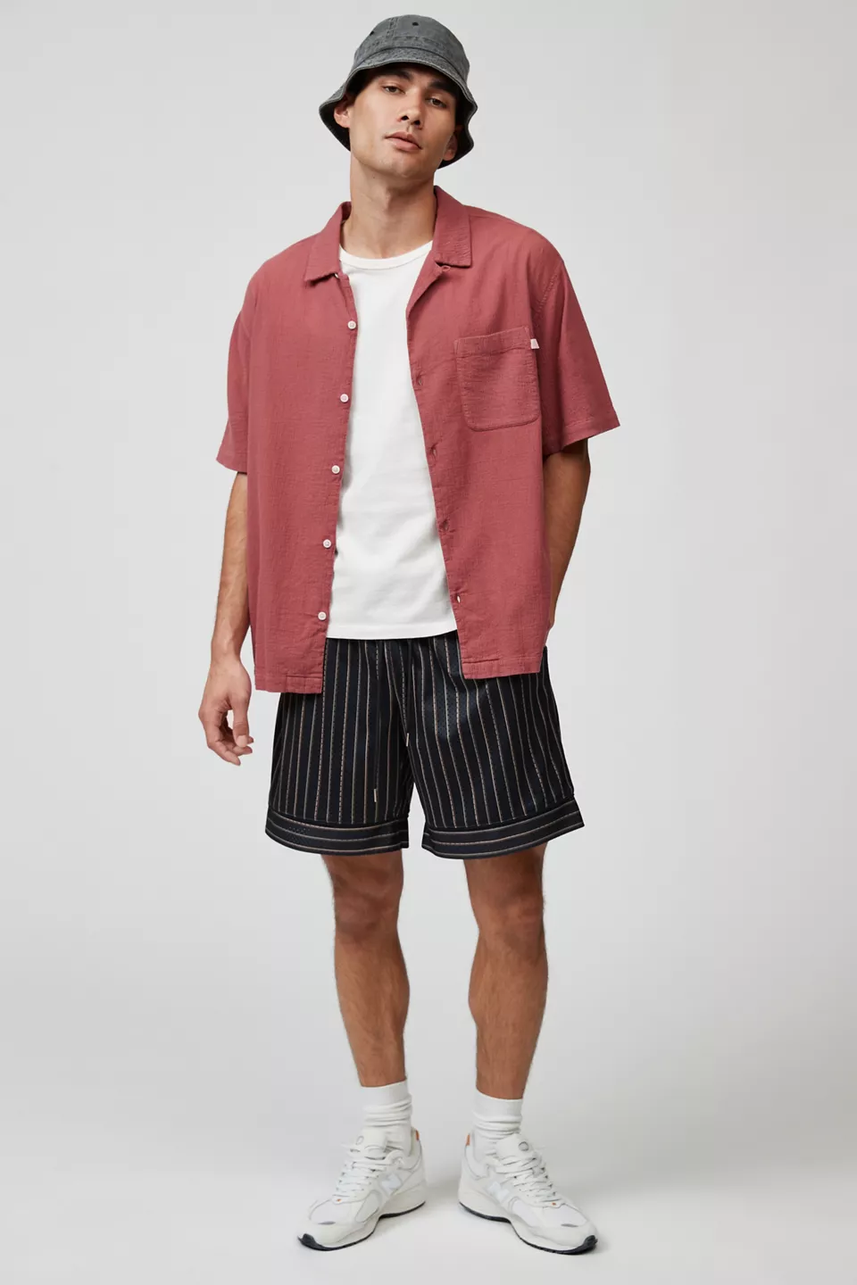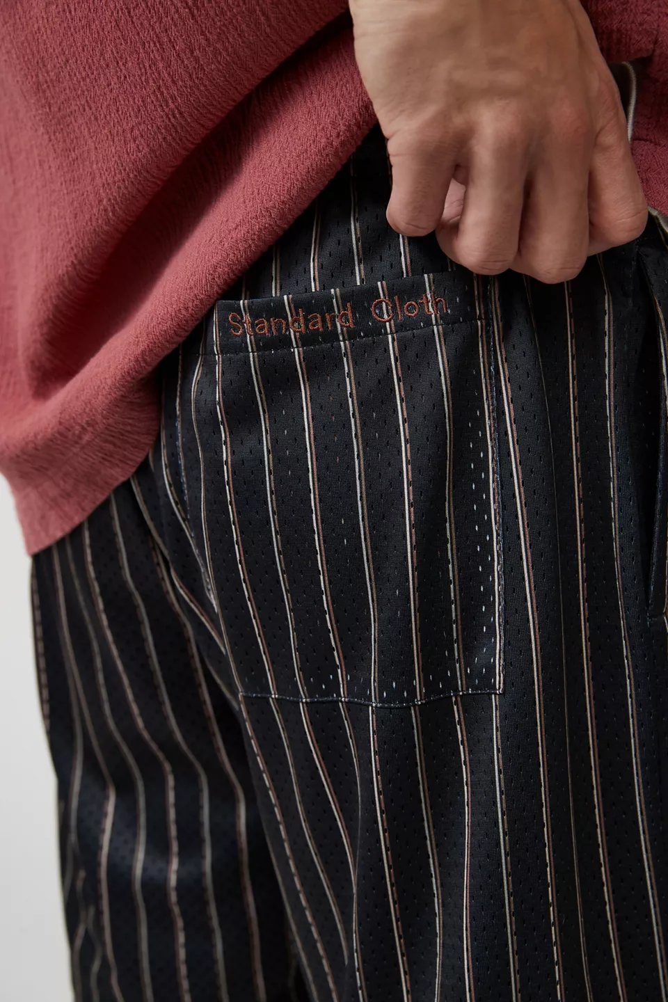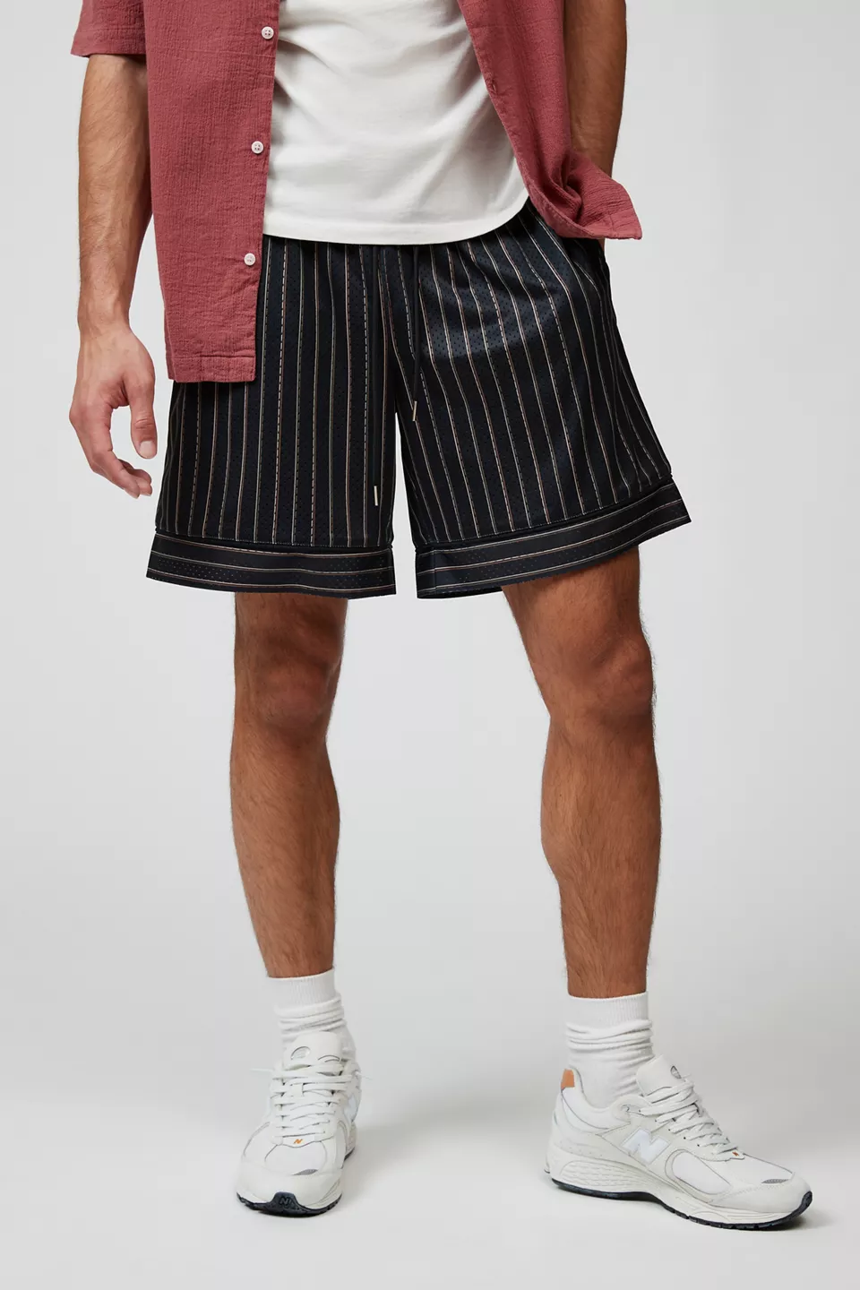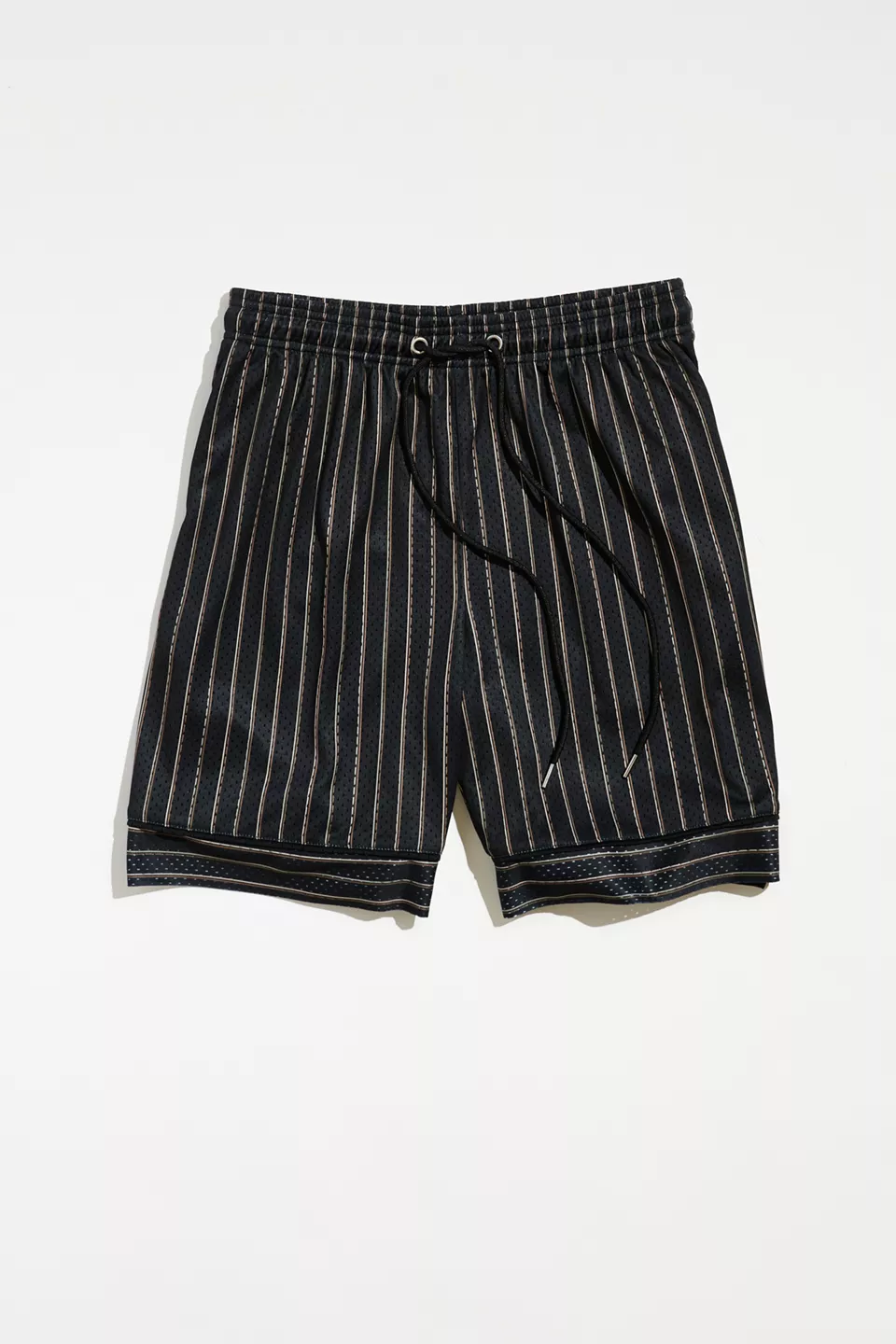 Stripe pattern mesh basketball shorts by Standard Cloth. Fitted with pockets at the sides and back. Includes an elastic waistband with an adjustable tie at the waist. Urban Outfitters exclusive.