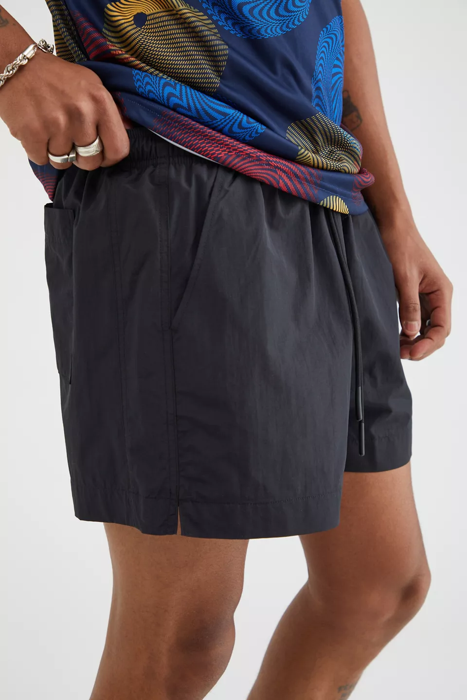 Nylon shorts by Standard Cloth. Basic silhouette with 4" inseams Fitted with pockets. Includes an elastic waistband & adjustable tie closure. Urban Outfitters exclusive.