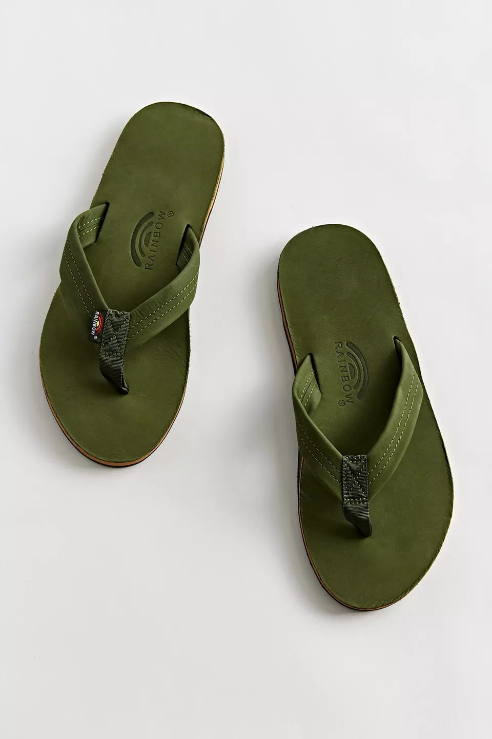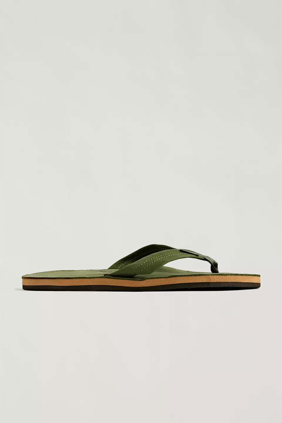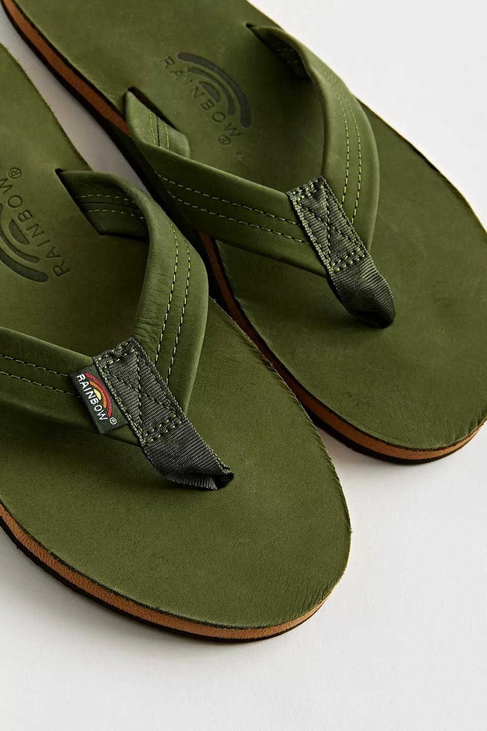 Essential flip flops by Rainbow crafted from leather with a 1" strap. Single layer arch style with a non-slip outsole.