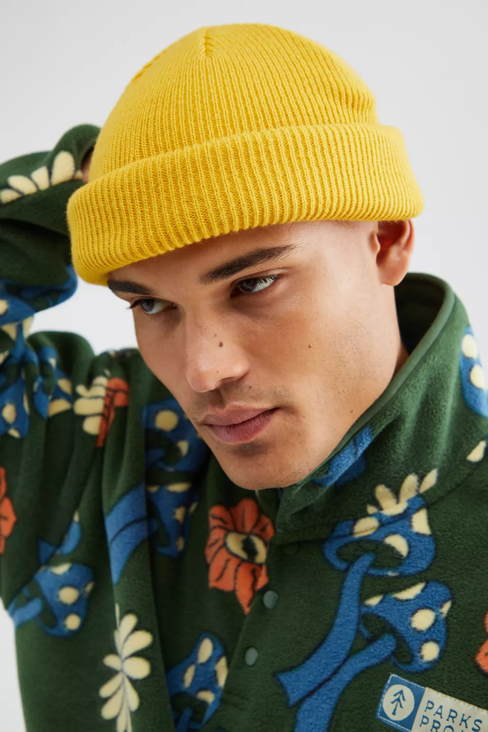 Short roll beanie from Urban Outfitters, crafted in a circular knit from an acrylic fabrication. Finished with an adjustable roll top for a customizable wear.