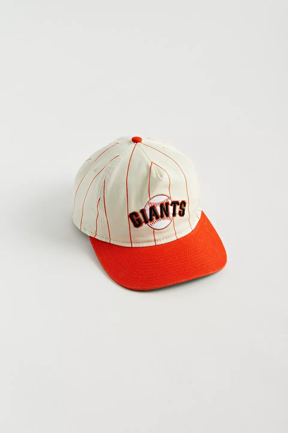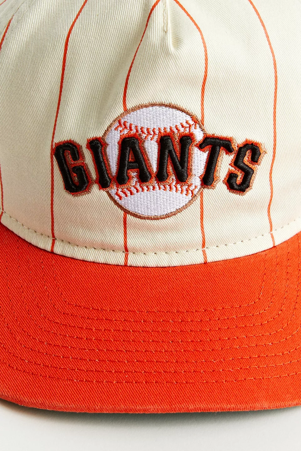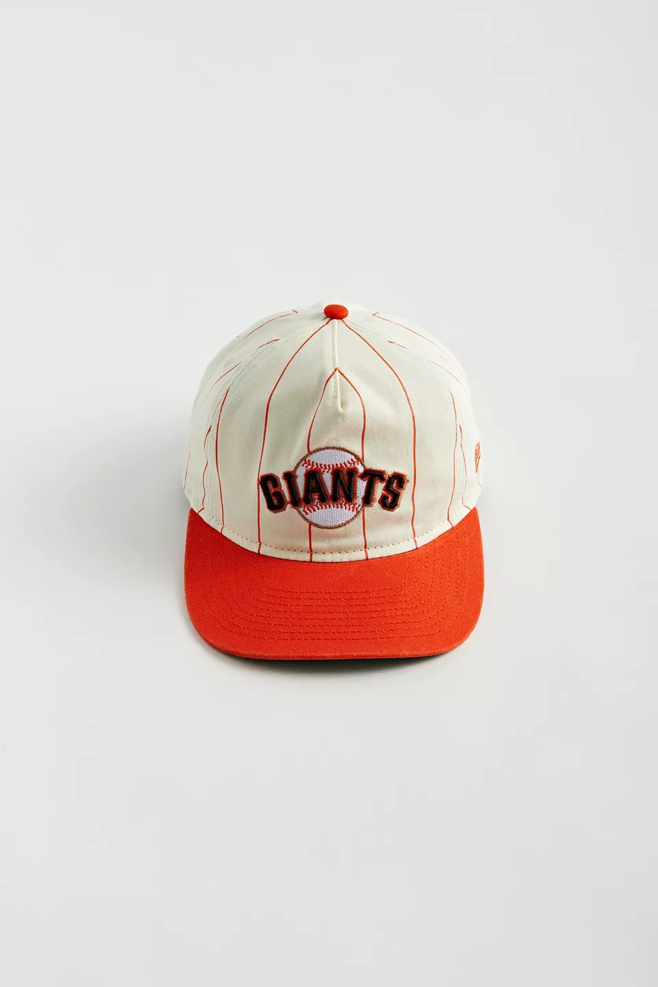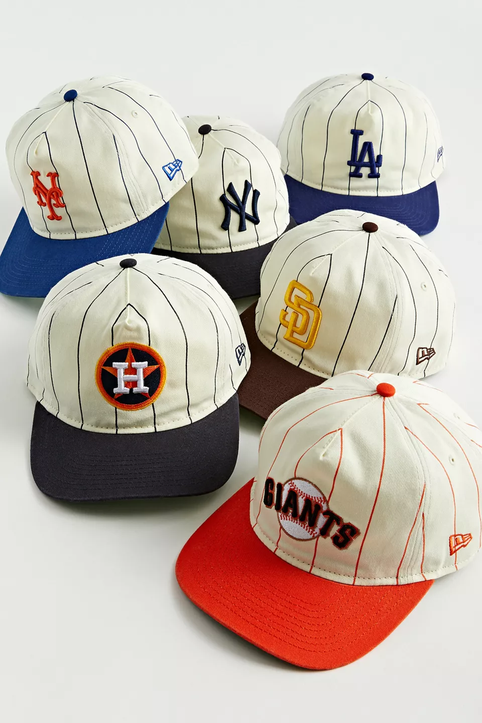 Pinstripe pattern MLB team hat by New Era. Cotton canvas paneled hat with an adjustable snapback closure.