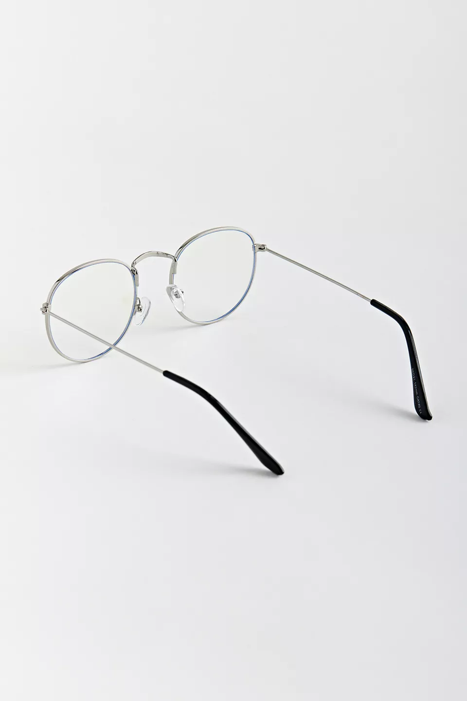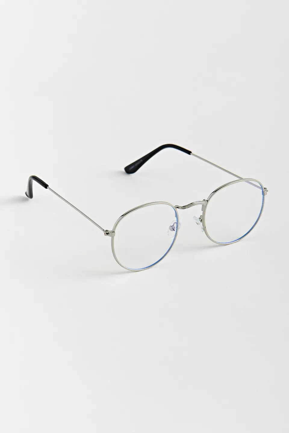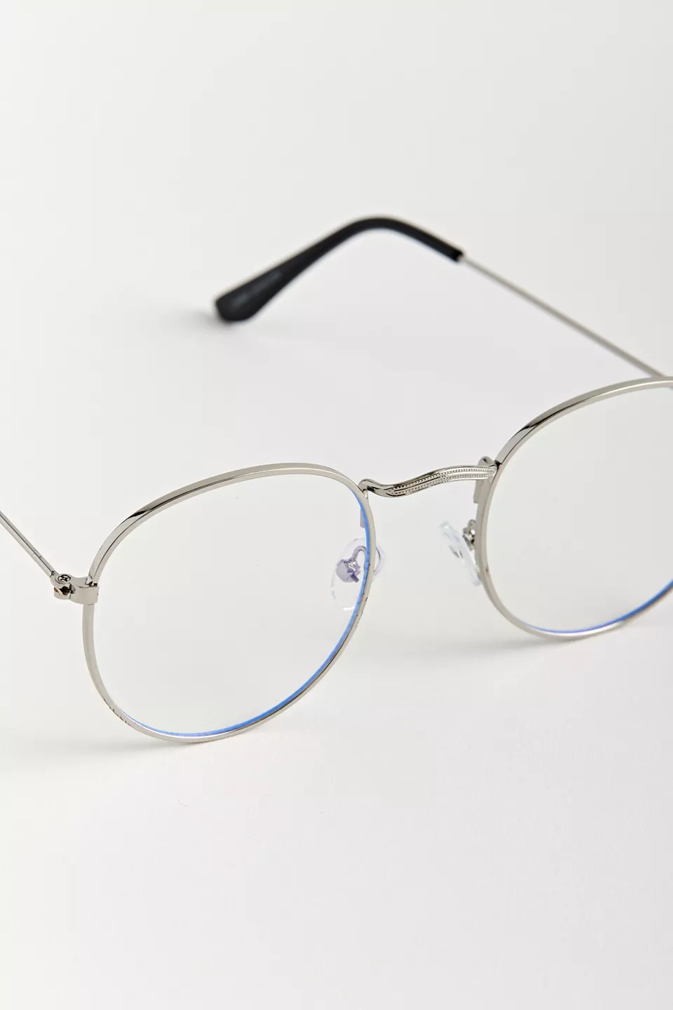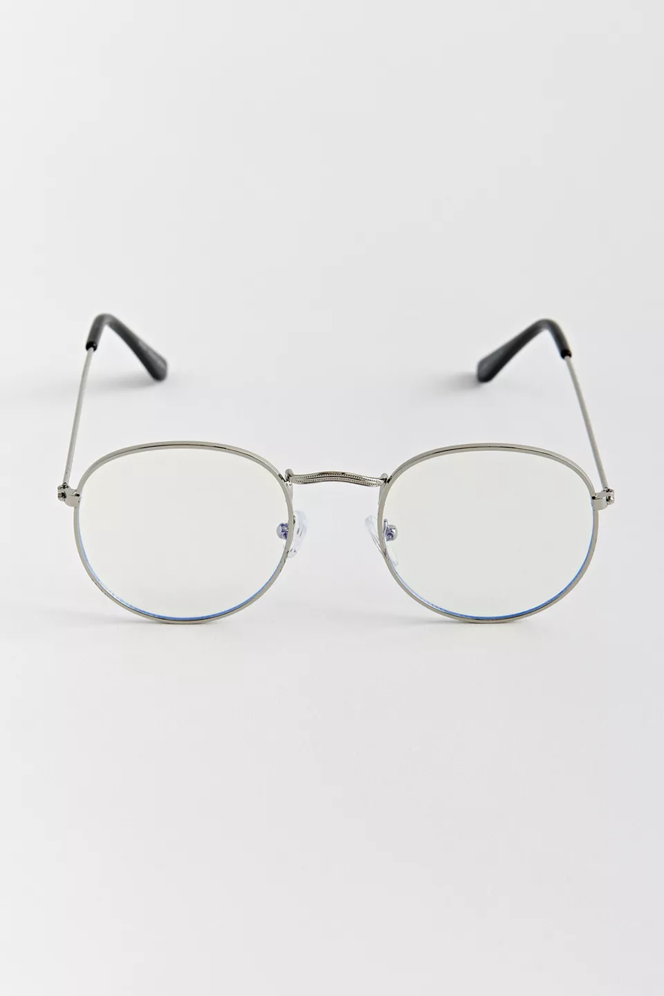 Round silhouette blue light glasses. Features a classic look wire frame with a padded nose bridge. Finished with non-magnifying clear lenses.
