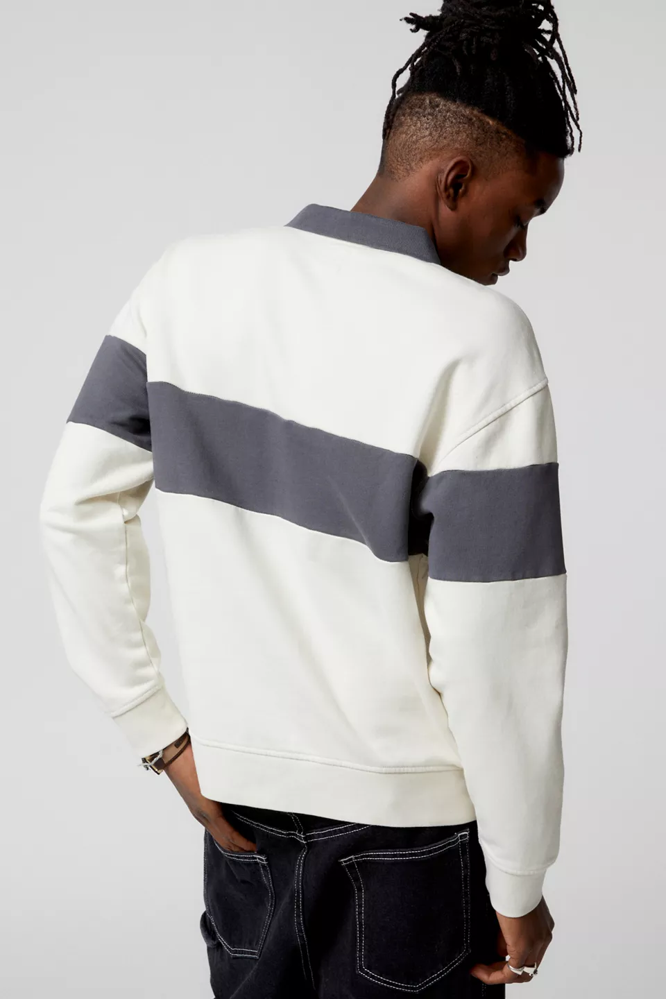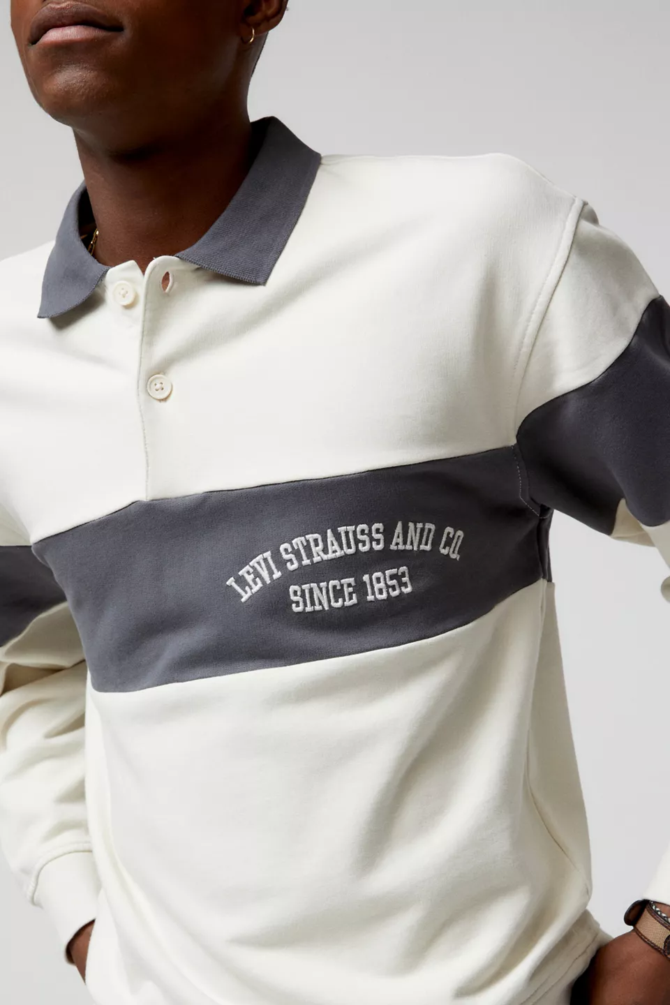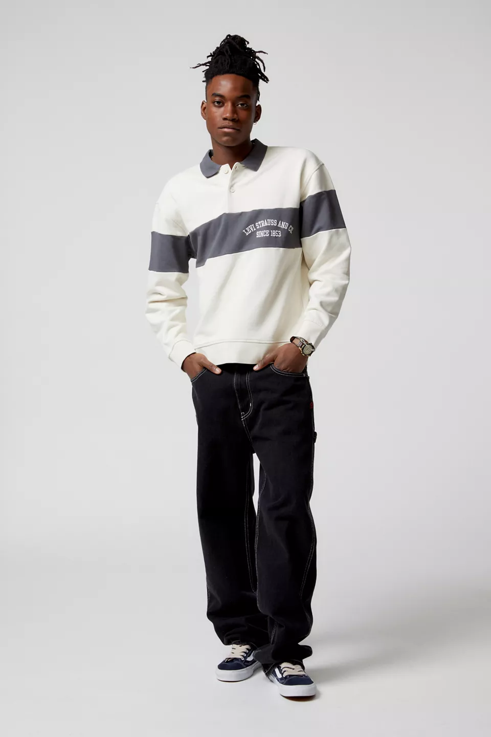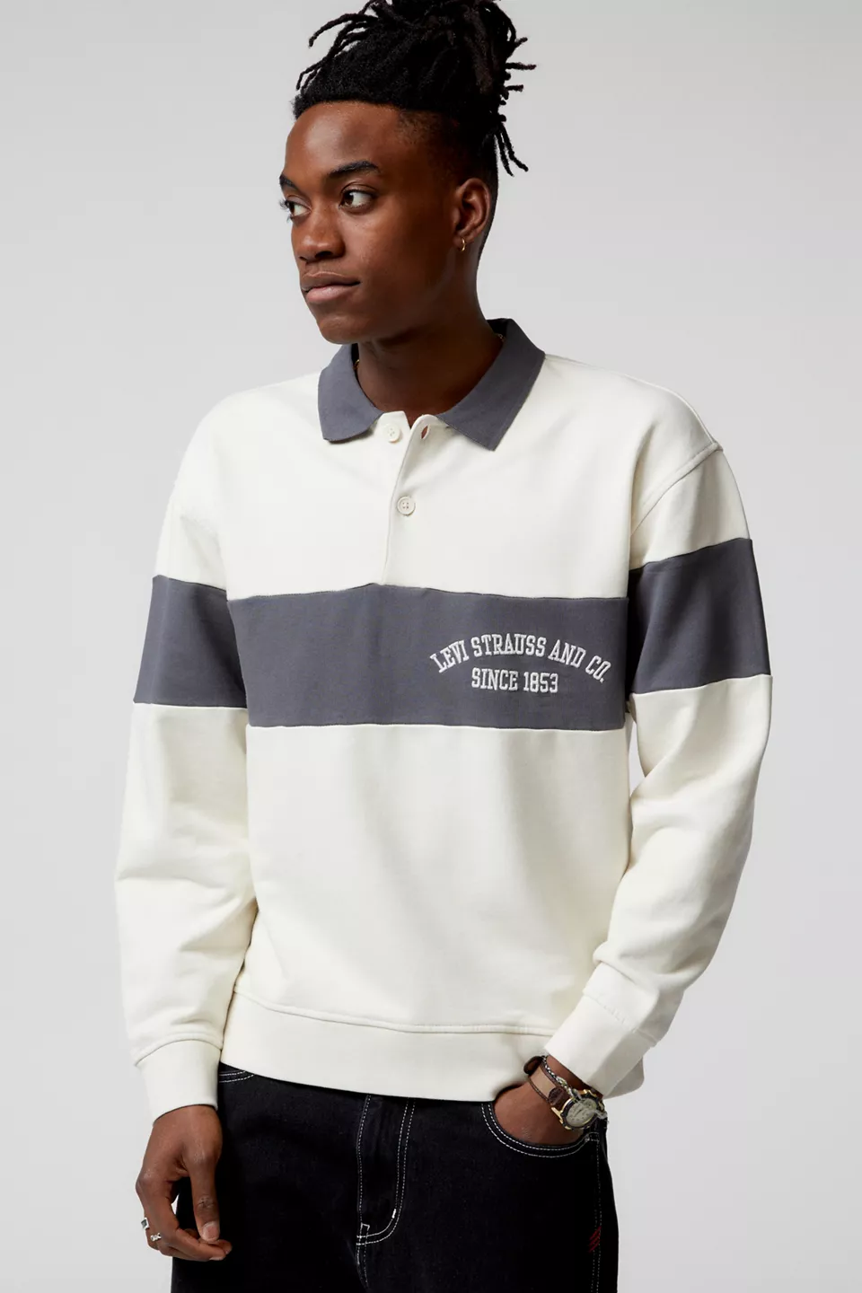 Polo collar pullover sweatshirt by Levi’s. Striped look with text at the left chest. Fitted with a partial button closure at the front. Since 1873, Levi’s® has stood for classic American style and effortless cool. From their classic 501 jeans, modern 511 slim fit jeans, Trucker denim jackets and everything in between, they get it right every time.