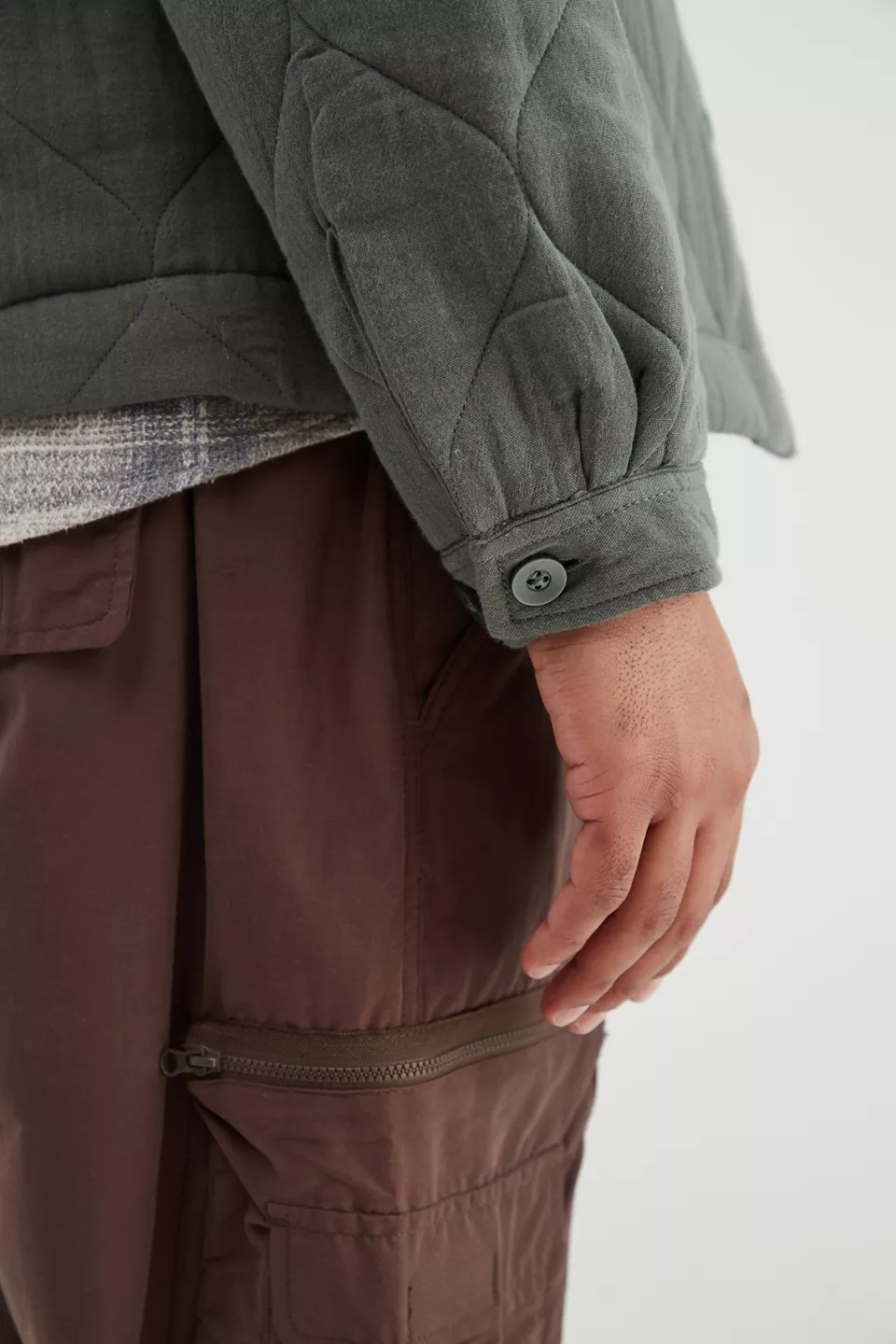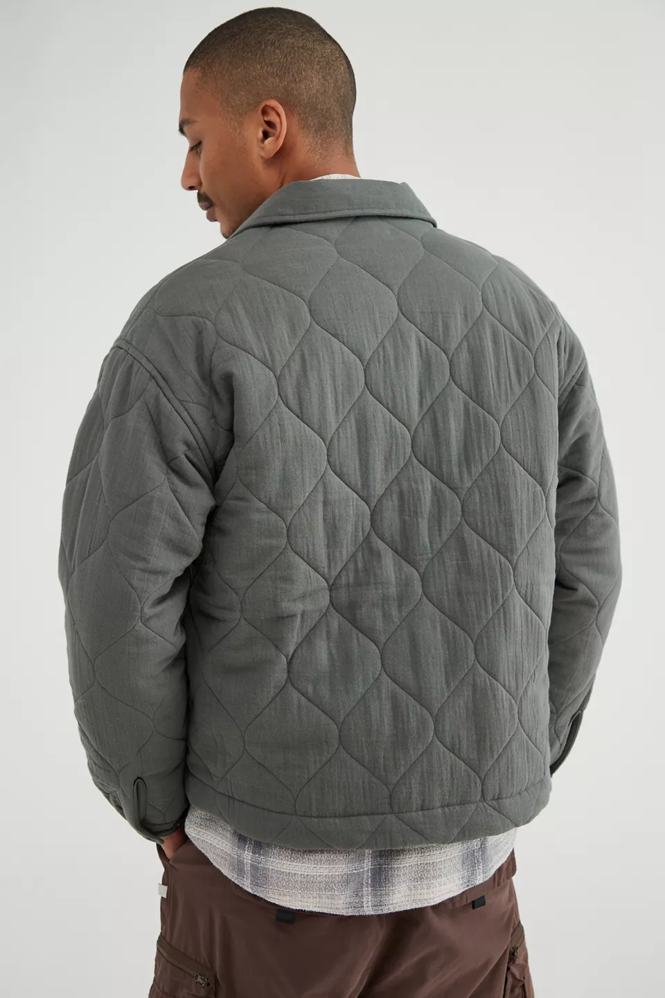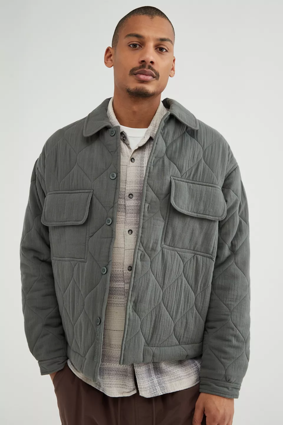 Quilted shirt jacket by Standard Cloth. Button-down style with flap pockets at the chest and a tab collar. Urban Outfitters exclusive.