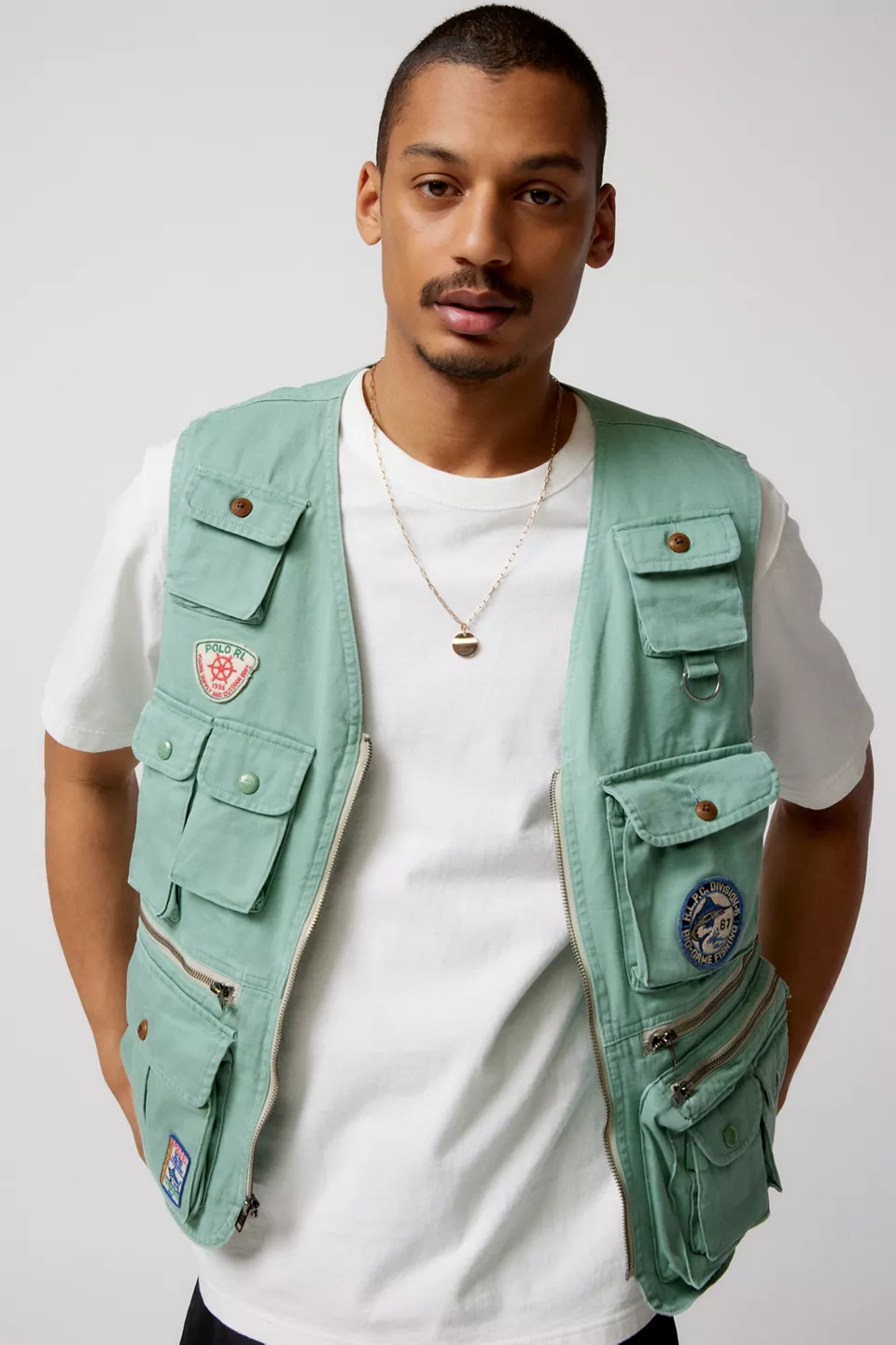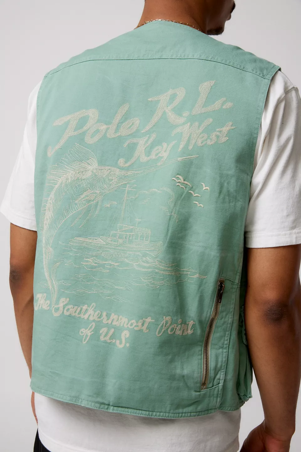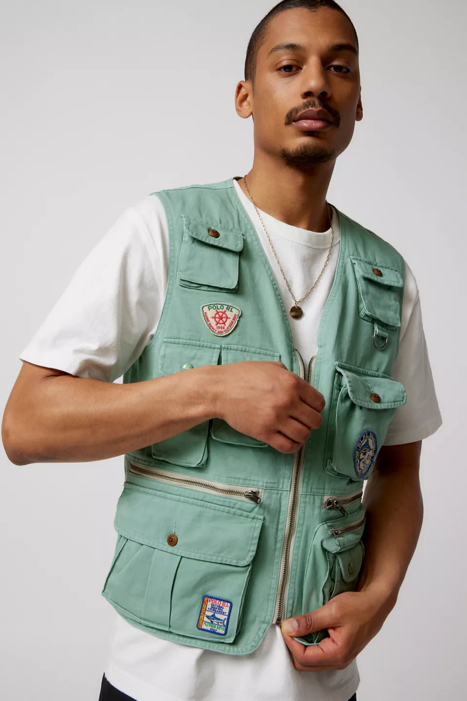 Utility vest by American sportswear label Polo Ralph Lauren. Durable cotton canvas with allover flap & zip closure pockets. V-Neckline silhouette with a zip closure front. Topped with patch accents and chainstitch embroidered detailing.